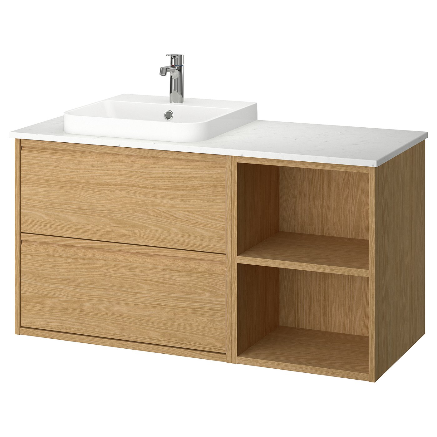 This solution has a little of everything. Both open and closed storage for decorative items and essentials, counterspace to keep things handy and the warm feel of wood to add character to your space.